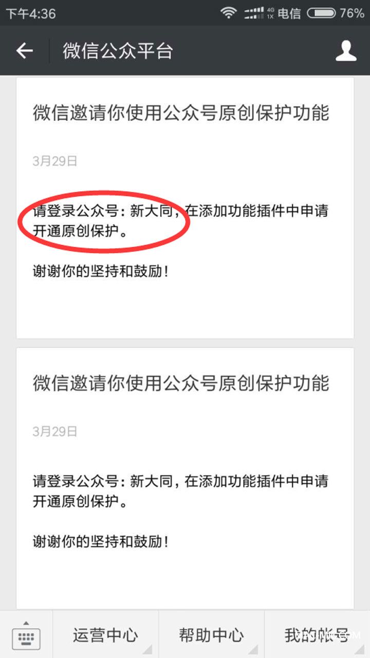 今天下午踏進(jìn)辦公室,剛坐到位置上不久,就聽(tīng)小編一聲驚呼:“我們獲得微信原創(chuàng)了”,高興的我差點(diǎn)從樓梯上掉下去,果然,“新大同”微信公眾平臺(tái)(sxdt_net)成為官方邀請(qǐng),獲得申請(qǐng)開(kāi)通“原創(chuàng)聲明”功能。