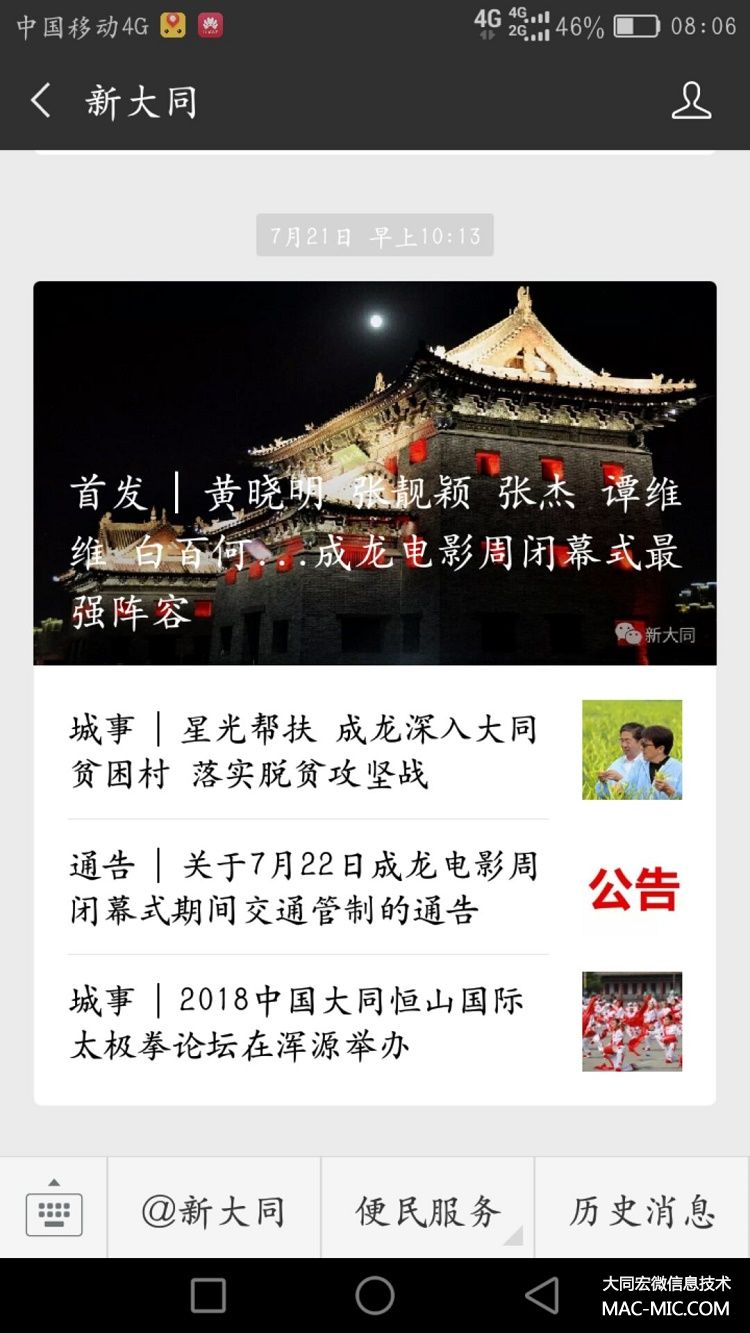 7月21日,由宏微信息技術(shù)旗下新大同微信平臺首發(fā),新大同網(wǎng)、今日頭條新大同號,搜狐新大同號等全媒體陣容推出的《首發(fā) | 黃曉明 張靚穎 張杰 譚維維 白百何...成龍電影周閉幕式最強陣容》一文在網(wǎng)絡(luò)一經(jīng)推出就開始熱傳。成龍電影周在大同舉辦,閉幕式廣受關(guān)注,新大同內(nèi)容發(fā)送及時,內(nèi)容獨特,編排新穎,受到眾多關(guān)心大同旅游發(fā)展、關(guān)系成龍動作電影節(jié)的網(wǎng)友一致好評。