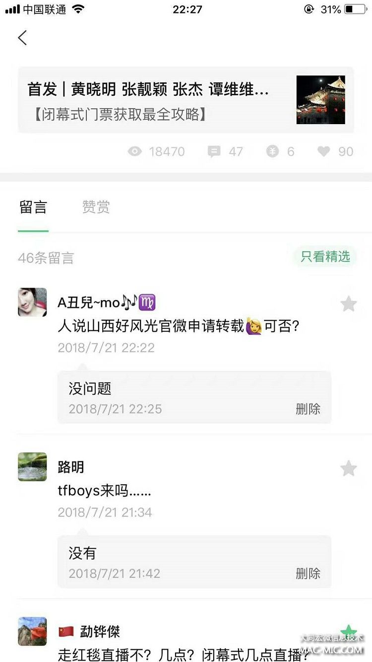 在獲得小編同意并授權(quán)后,當(dāng)晚11:30分左右,由新大同原創(chuàng)《首發(fā) | 黃曉明 張靚穎 張杰 譚維維 白百何...成龍電影周閉幕式最強陣容》在人說山西好風(fēng)光官微發(fā)送,將成龍電影周閉幕式消息分享給全國、全世界的粉絲。