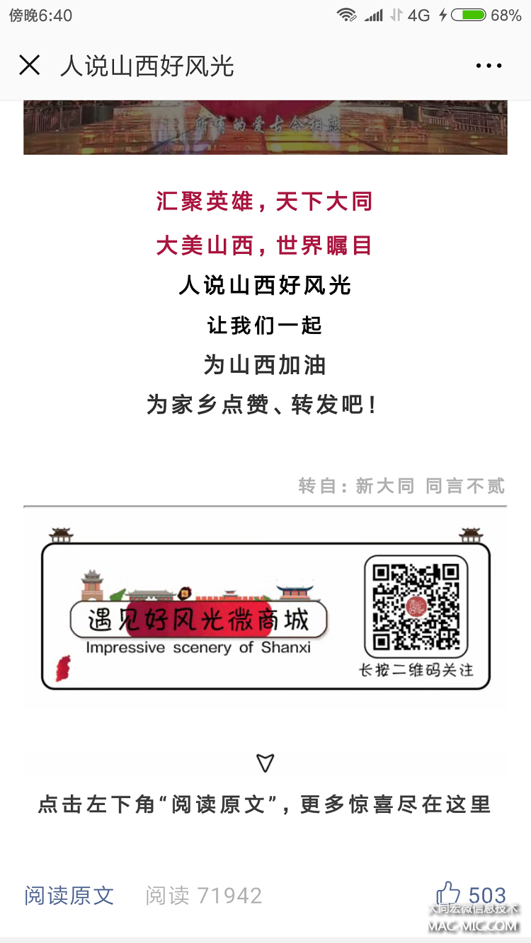 截止發(fā)稿時,新大同原創(chuàng)微文《首發(fā) | 黃曉明 張靚穎 張杰 譚維維 白百何...成龍電影周閉幕式最強陣容》在人說山西好風(fēng)光的閱讀量已經(jīng)達到7W+,新大同平臺通過不斷完善創(chuàng)新發(fā)展,為我們大同旅游、為山西旅游發(fā)展不斷貢獻自己的小小力量。