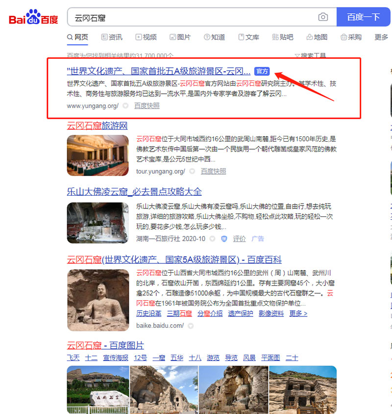 在百度搜索欄里只需要搜索“云岡石窟”四個(gè)字,即可顯示云岡石窟藍(lán)標(biāo)官網(wǎng)(如下圖)。