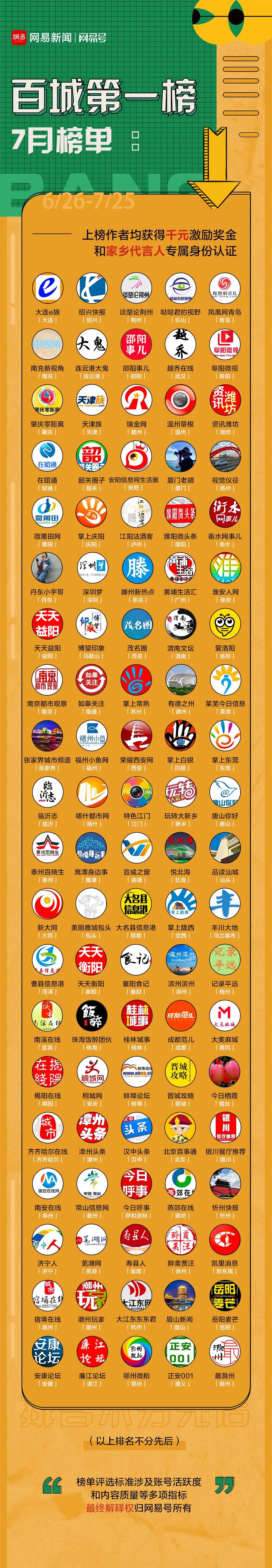 網(wǎng)易號“尋找家鄉(xiāng)代言人”系列扶持計(jì)劃之百城第一榜,旨在獎勵為用戶提供多元化本地內(nèi)容的優(yōu)質(zhì)本地作者。升級版“百城第一榜”專注于扶持創(chuàng)作方向?yàn)楸镜爻院韧鏄贰⒈镜厣鐣䶮狳c(diǎn)、本地人文歷史的自媒體作者。榜單根據(jù)本地作者的發(fā)文數(shù)量、發(fā)文質(zhì)量、原創(chuàng)度、活躍度和互動等多重數(shù)據(jù)表現(xiàn)進(jìn)行評選。上榜賬號可獲得千元現(xiàn)金獎勵、“家鄉(xiāng)代言人”專屬身份認(rèn)證和運(yùn)營一對一發(fā)文指導(dǎo)等多項(xiàng)福利。