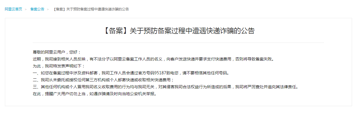 阿里云【備案】關(guān)于預(yù)防備案過程中遭遇快遞詐騙的公告