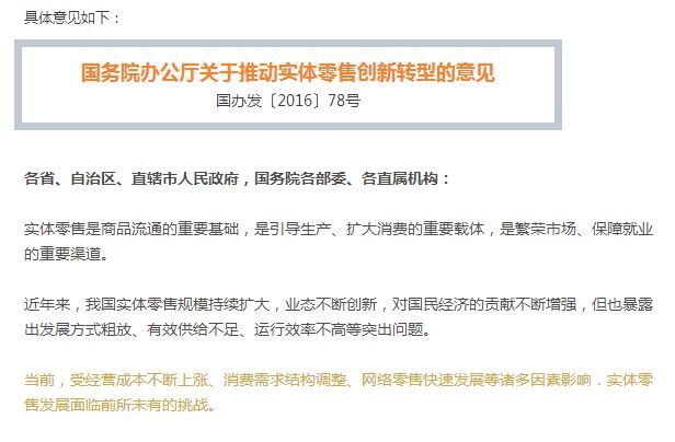 實體零售是商品流通的重要基礎,是引導生產(chǎn)、擴大消費的重要載體,是繁榮市場、保障就業(yè)的重要渠道。近年來,我國實體零售規(guī)模持續(xù)擴大,業(yè)態(tài)不斷創(chuàng)新,對國民經(jīng)濟的貢獻不斷增強,但也暴露出發(fā)展方式粗放、有效供給不足、運行效率不高等突出問題。當前,受經(jīng)營成本不斷上漲、消費需求結構調(diào)整、網(wǎng)絡零售快速發(fā)展等諸多因素影響,實體零售發(fā)展面臨前所未有的挑戰(zhàn)。為適應經(jīng)濟發(fā)展新常態(tài),推動實體零售創(chuàng)新轉型,釋放發(fā)展活力,增強發(fā)展動力,經(jīng)國務院同意,現(xiàn)提出以下意見: