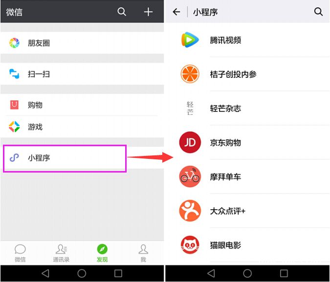 每次微信上線新功能,幾乎都會在第一時間刷爆朋友圈。這一次不同,如果不是通過微信里的好友分享,你幾乎無法發(fā)現(xiàn)小程序已經(jīng)上線了。用戶只有第一次打了一個小程序后,才會在用戶的“發(fā)現(xiàn)”欄出現(xiàn)一個“小程序”入口,并且入口下只會顯示用戶打開過的程序,系統(tǒng)不推薦。