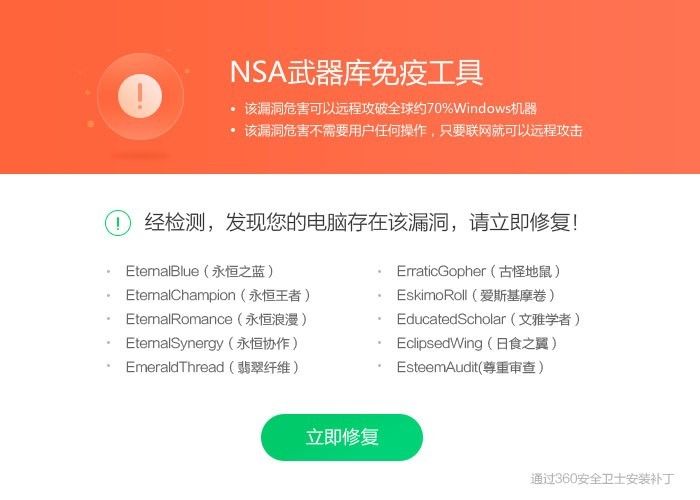 如果沒中毒,立即下載NSA武器庫(kù)免疫工具打補(bǔ)丁加固系統(tǒng),并下載文檔衛(wèi)士備份文檔